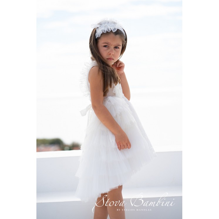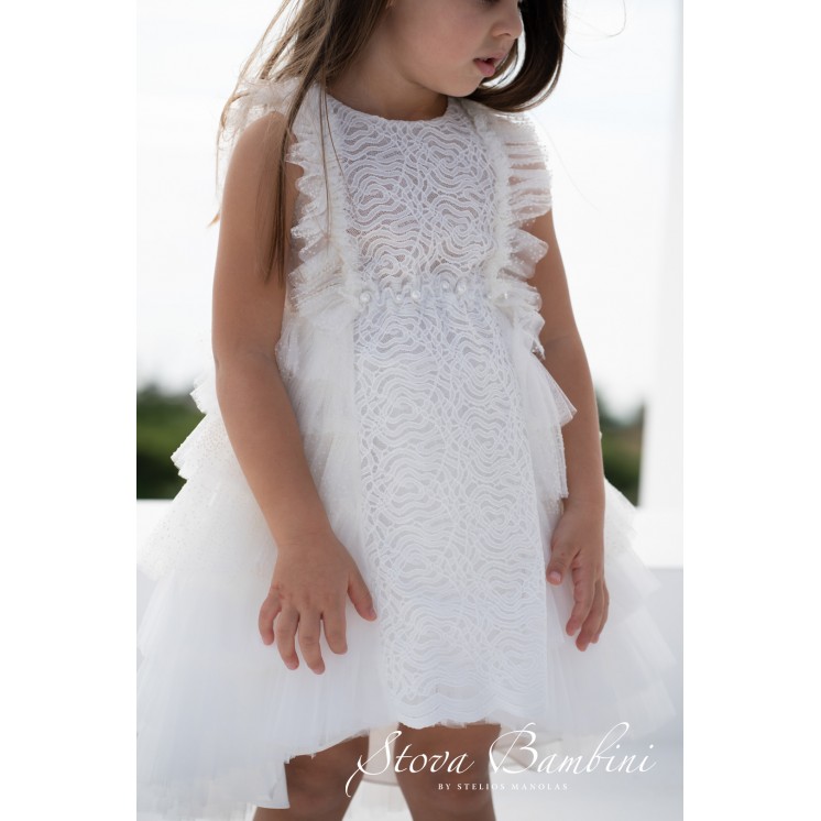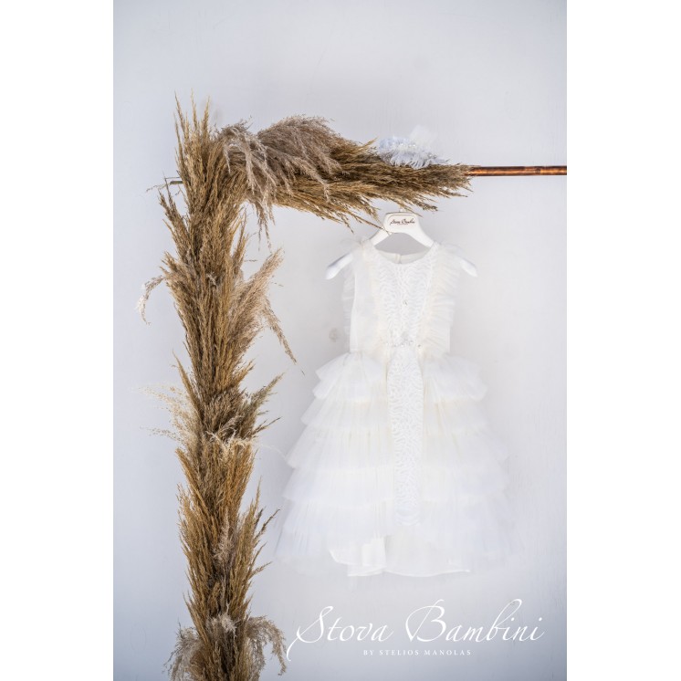 Ρομαντικό φόρεμα από εκπληκτική βαμβακερή δαντέλα κορδονέ τοποθετημένη εγκάρσια, με πολλαπλά μικρά βολάν στα πλάγια από επάνω έως κάτω, σχηματίζοντας ένα υπέροχο οπτικό εφέ διακριτικού όγκου με διαφάνειες. Τα μανίκια δημιουργούνται από τούλι διακοσμημένα με all over τρέσα. Η πλάτη ξεχωρίζει με δύο διακριτικά ανοίγματα ενώ την μέση διακοσμεί ζωνάκι φιόγκος. Εσωτερικά υπάρχει βαμβακερή, υποαλλεργική φόδρα και υποαλλεργικό βαμβακερό τούλι. Το κορσάζ στολίζει στο κέντρο μικρή σειρά από κεντημένες πέρλες. Ασορτί κορδέλα με τούλινο βολάν και πέρλες για τα μαλλάκια.