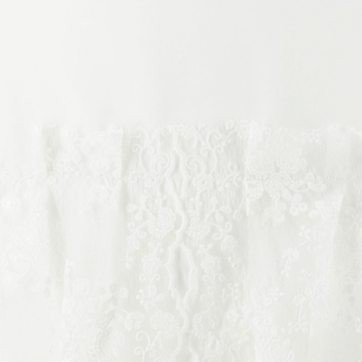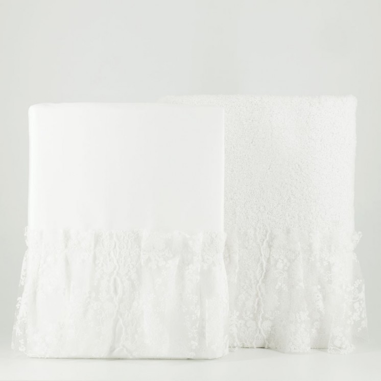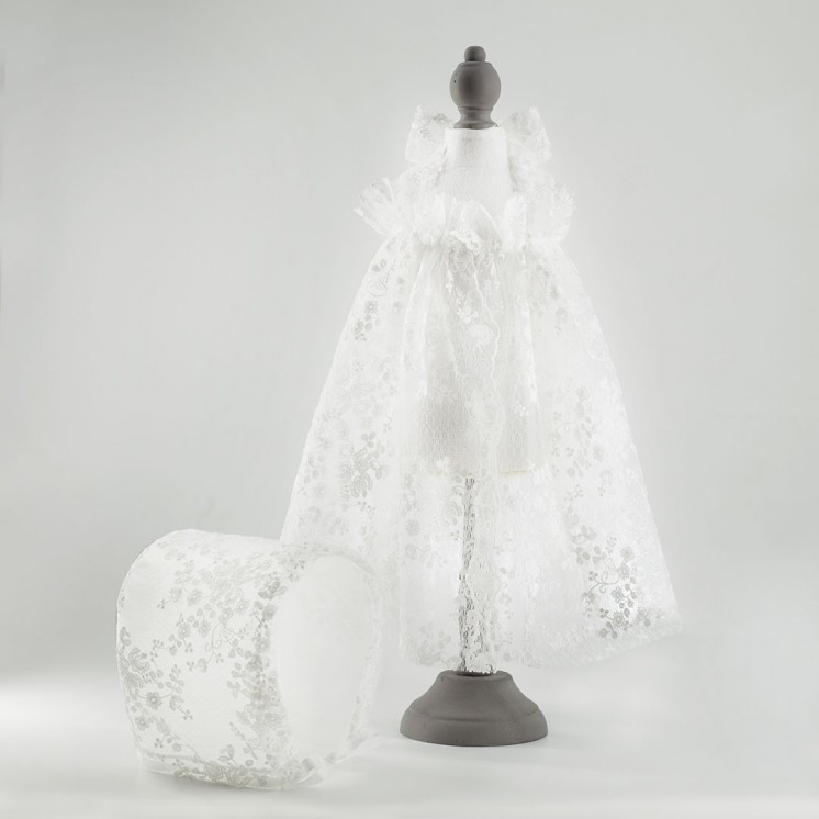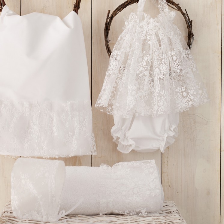 Κεντημένη ανάγλυφη δαντέλα με πλούσιο βολάν. Συνοδεύεται από  φορεματάκι με φίνα ανάγλυφη δαντέλα με δέσιμο στον λαιμό, για να μπορεί να φορεθεί και strapless.Bonnet  καπελάκι ασορτί και βαμβακερή φουφούλα.