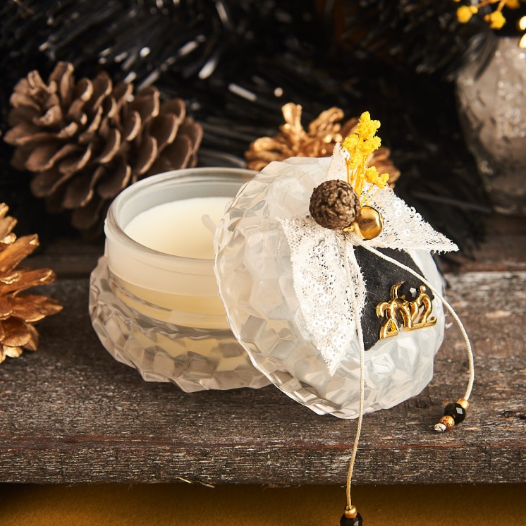 Στολισμένο με λευκή κορδέλα με παγέτες, μαύρο βελούδο, κίτρινα αποξηραμένα λουλούδια, κουκουνάρι, χρυσό κουδουνάκι, χρυσό μεταλλικό 2022 και κρυστάλλινες χάντρες.