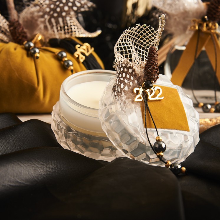 Στολισμένο με μουσταρδί βελούδο, χρυσή διχτυωτή κορδέλα, πουα φτερό, κουκουνάρι, χρυσό μεταλλικό 2022 και μεταλλικές χάντρες.